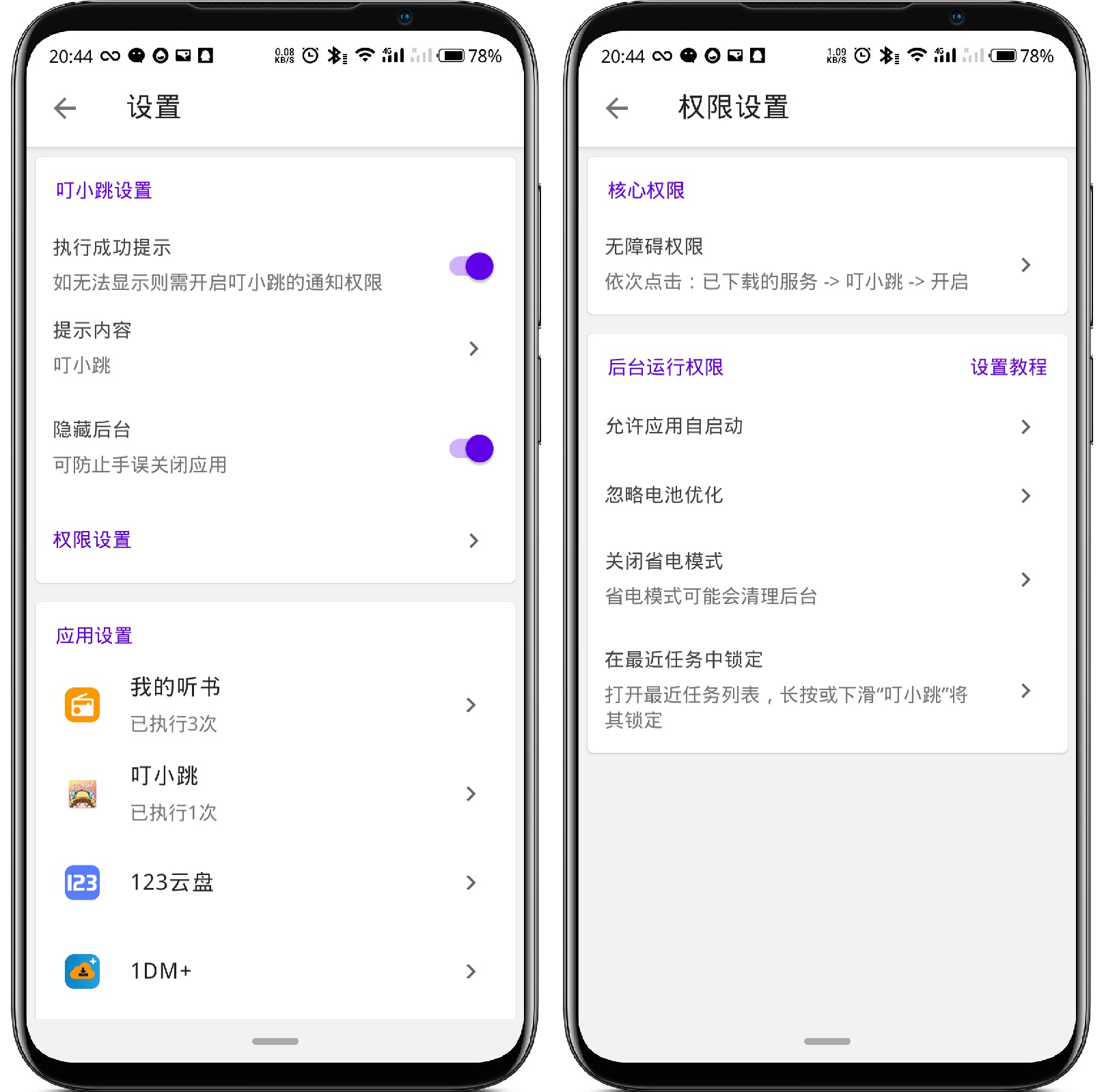 请把手机调到静音模式或将音量调至最低,点击观看广告时会有声音,你的每一次点击都是对我的最大支持! 叮小跳是一款运行在安卓手机中可跳过开屏广告的APP,界面精简、操作易懂。 安装叮小跳可节约APP启动时间以及防止误触进入广告页面,大大提高APP开启效率。 🚶♂️新手上路 1.请在安装完成后运行叮小跳,并在叮小跳APP中找到通用设置并点击打开。 2.点击“权限设置”,在权限设置中将需要授权的权限全部授予;如果权限不全部授予,那么在使用的过程中有可能导致部分功能无法使用。 需要的权限👇 无障碍权限 点击查阅 悬浮窗权限 点击查阅 允许应用自启动 电池优化 在MIUI14中可能会遇到叮小跳无法正常使用或不能跳过广告的情况,请参照以下教程进行设置 点击查阅 3.进入“叮小跳”,并在应用首页找到“通用设置”点击进入 4.找到“权限设置”一栏,并进入 5.在“权限设置”里面,首先需要开启“无障碍服务”;开启“无障碍”后,再开启悬浮窗权限。 6.开启“无障碍服务”以及“悬浮窗”两项权限后,还需要对图中所示的权限进行开启。 开启“允许应用自启动” 打开“忽略电池优化” 打开“允许后台使用电量” 手动开启“关闭省电模式”(省电模式暂无法一键设置) 并在“最近任务”中将叮小跳进行锁定