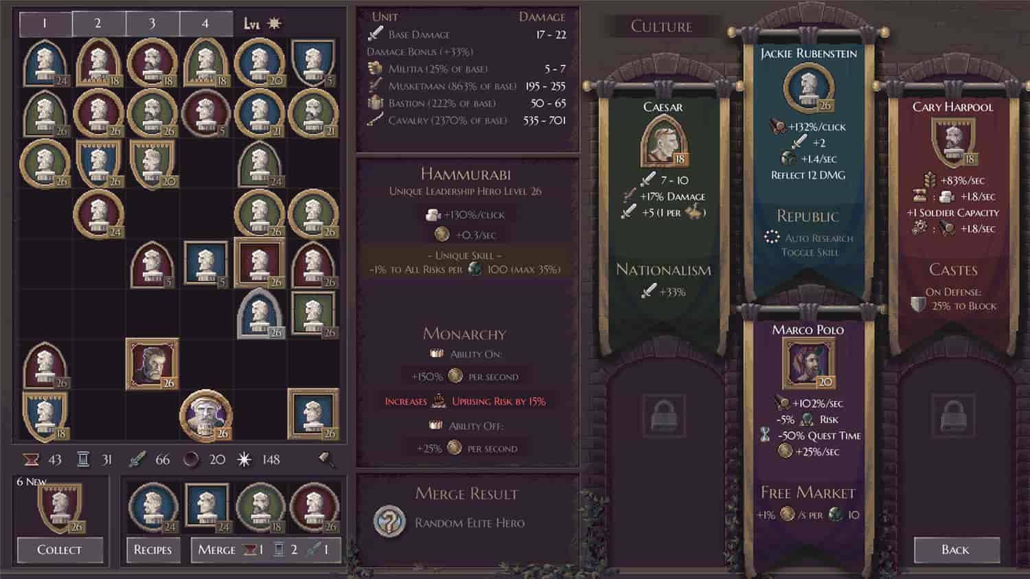 一款点击放置策略游戏,扩张、建设、研究、战斗、收集英雄,并在善恶之间做出选择。通过挑战历史战役逐步提升难度。游戏中还有猛犸象。