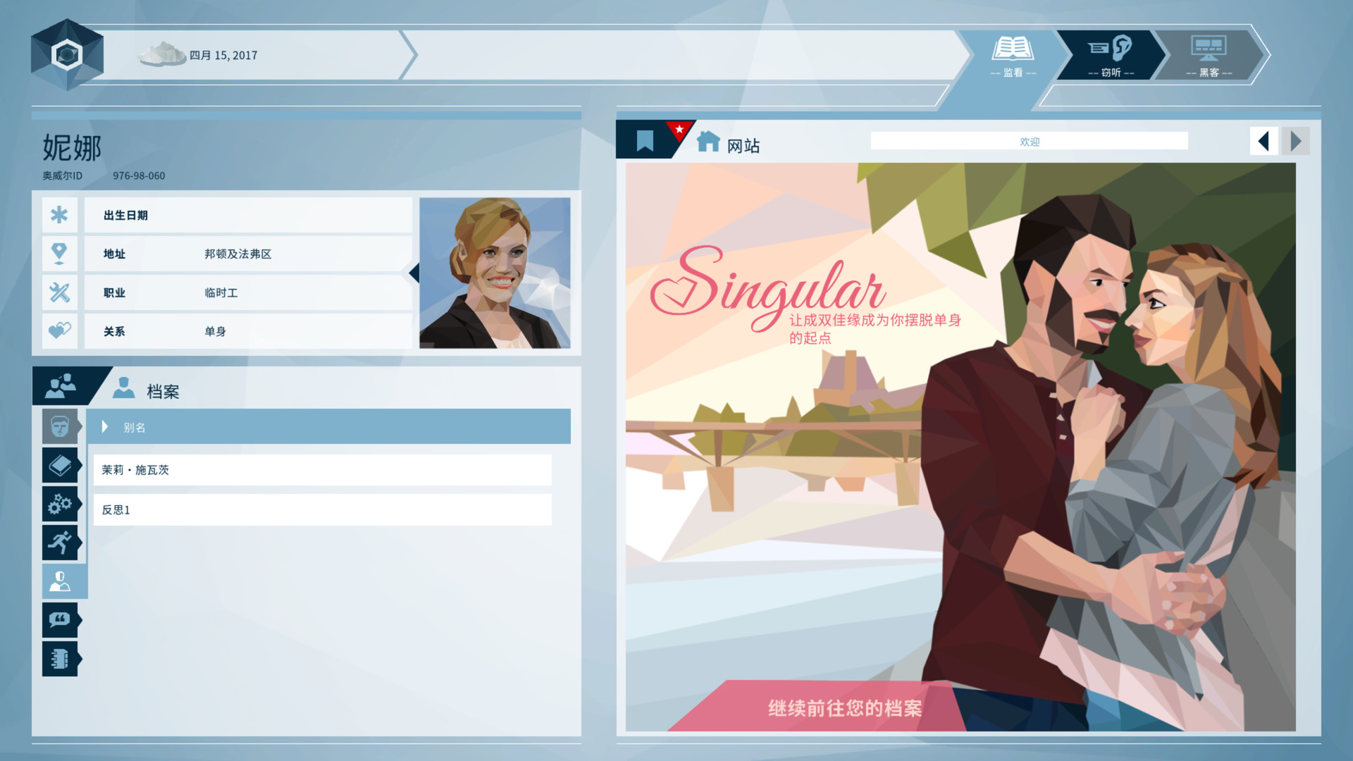 在游戏中获得至高权力。调查公民的生活,找到一系列恐怖袭击的幕主使。你可以获取来自互联网、个人通信和私人文件的信息。但是请注意,你提供的信息会产生不同的后果。