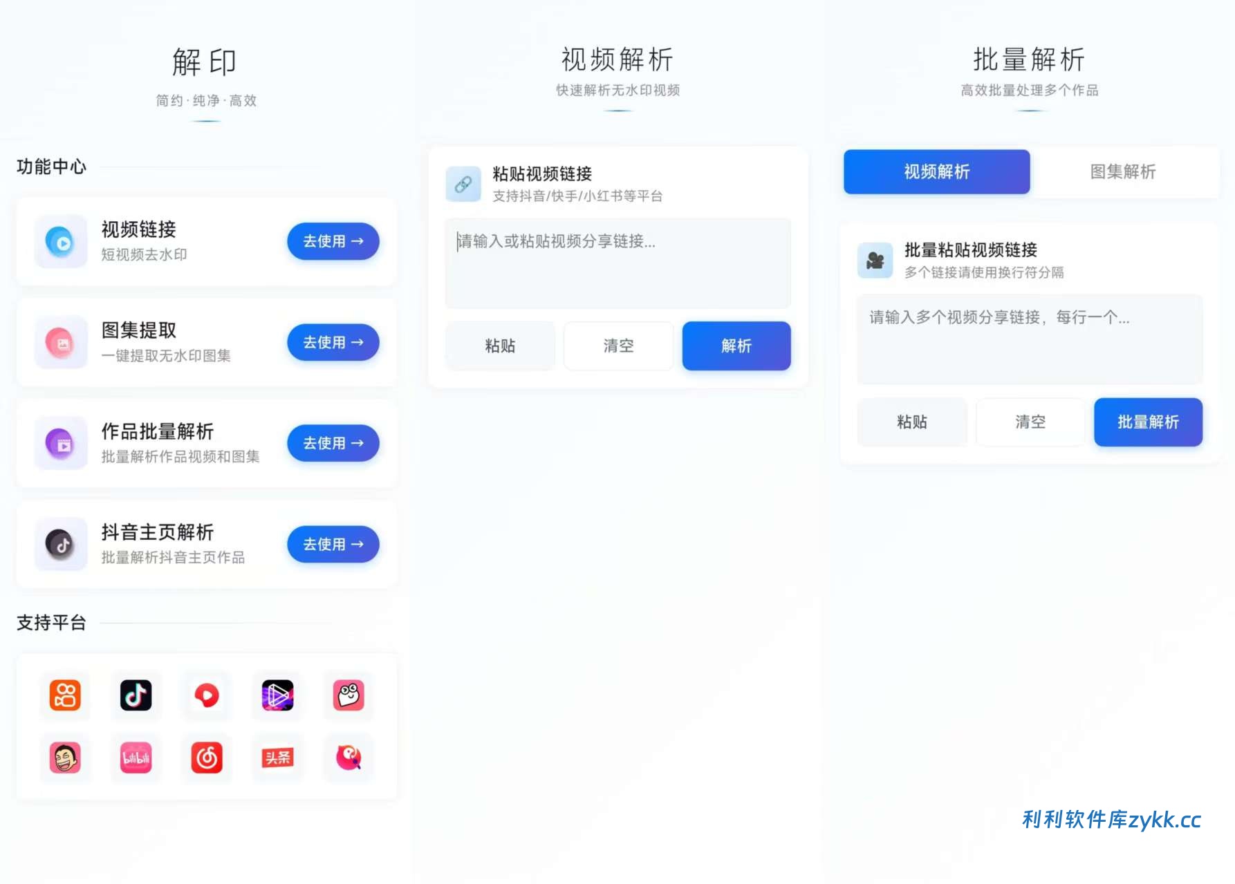 “解印去水印” 是一款专注于视频水印去除的工具软件,旨在为视频创作者、普通视频爱好者、学生及职场人等提供便捷、高效的水印处理方案。它的核心功能是通过解析视频链接,智能识别并去除视频中的水印,无论是从抖音、快手等短视频平台保存的视频,还是影视平台片段、小众平台素材,只要获取有效链接,软件就能快速处理,让用户获得干净、无水印的视频素材,解决水印影响观感、可能涉及侵权等问题,满足不同人群对无水印视频的需求。